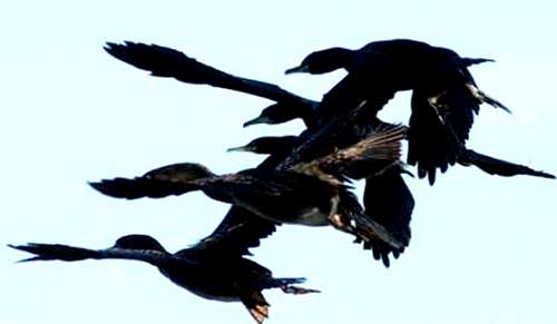 Oil-stained birds fly along the Oia coast in northwestern Spain, north of the Portuguese border, December 5, 2002. REUTERS/Miguel Vidal